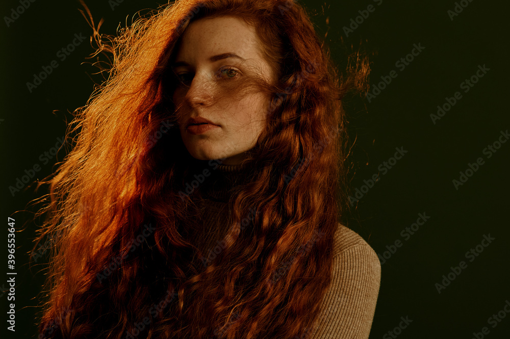 Beautiful Redhead Woman With Natural Long Curly Hair Posing On Dark Olive Green Background Hair Care Beauty Conception Copy Empty Space For Text Stock Photo Adobe Stock